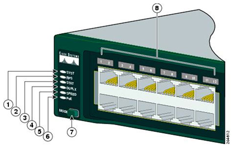 La figura muestra los indicadores LED, el botón de modo y los puertos en la parte delantera izquierda de un interruptor. Los indicadores LED numerados 1 - 6 de arriba a abajo son: SYST, RPS, STAT, DUPLX, SPEED y PoE. Debajo de los indicadores LED y etiquetados 7 en la figura está el botón de modo. Por encima de los puertos de conmutación y etiquetados 8 en la figura están los LEDs de puerto.