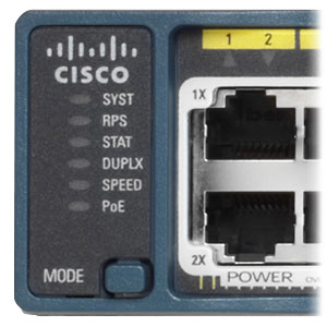 En la ilustración, se muestran los LED y el botón Mode de un switch Cisco Catalyst 2960.